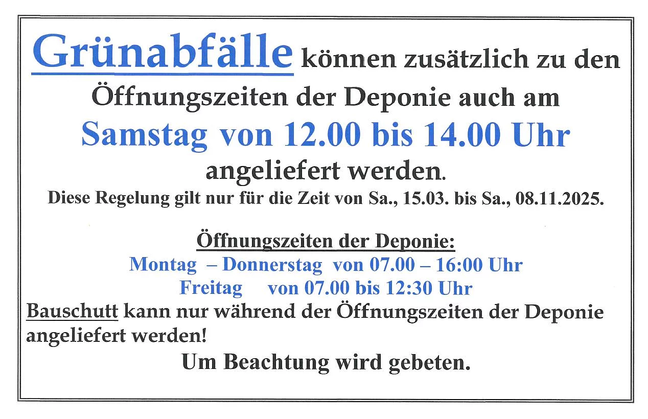 Bauschutt kann nur während der Öffnungszeiten der Deponie angeliefert werden!