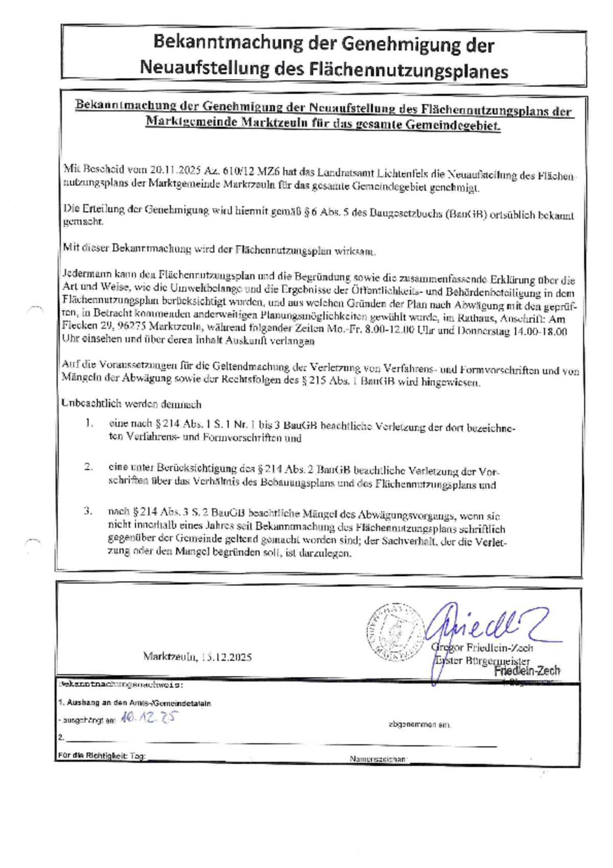 Jedermann kann den Flächennutzungsplan und die Begründung sowie die zusammenfassende Erklärung über die Art und Weise, wie die Umweltbelange und die Ergebnisse der Öffentlichekeits- und Behördenbeteiligung in dem Flächennutzungsplan berücksichtigt wurden, und aus welchen Gründen der Plan nach Abwägung mit den geprüften, in Betracht kommenden anderweitigen Planungsmöglichkeiten gewählt wurde, im Rathaus, Anschrift: Am Flecken 29, 96275 Marktzeuln, während folgender Zeiten Mo.-Fr. 8.00-12.00 Uhr und Donnerstag 14.00 - 18.00 Uhr einsehen und über deren Inhalt Auskunft verlangen.