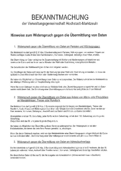 1. Widerspruch gegen die Übermittlung von Daten an Parteien und Wählergruppen