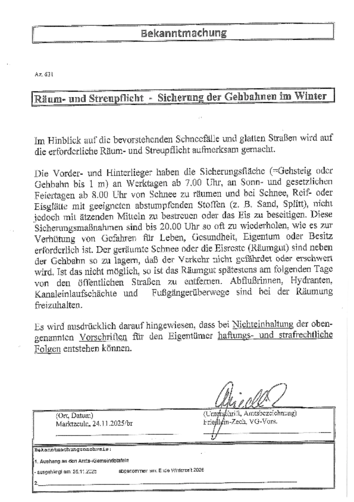 Bekanntmachung Räum- und Streupflicht