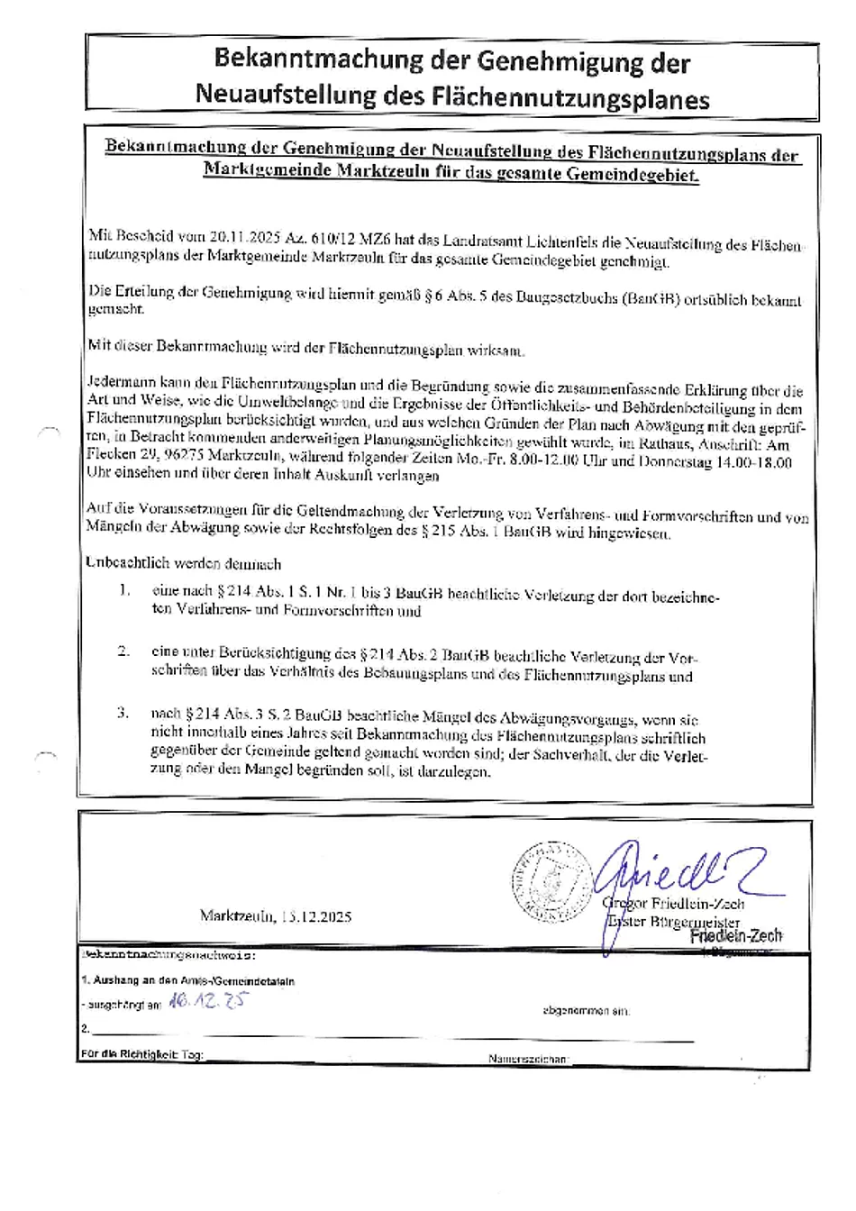 Die Marktgemeinde Marktzeuln gibt die Genehmigung der Neuaufstellung des Flächennutzungsplans für das gesamte Gemeindegebiet bekannt.