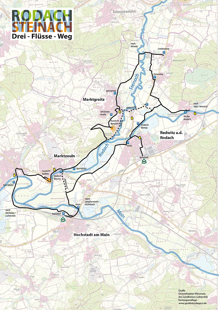Im Zuge eines gemeinsamen Gedankenaustauschs der Bürgermeister von Redwitz, Marktgraitz, Hochstadt und Marktzeuln zur touristischen Attraktivierung der nördlichen Landkreisgemeinden ist die Idee entstanden, einen neuen Wanderweg zu schaffen, der die drei Flüsse Rodach, Steinach und Main in einem Rundwanderweg miteinander verbindet. Die Konzeption und Realisierung des Drei-Flüsse-Weges erfolgte in Zusammenarbeit mit der Umweltstation Weismain sowie dem Tourismusverein Obermain-Jura e. V. Für die Ausschilderung, die in den nächsten Wochen erfolgen wird, sowie für die zukünftige Pflege des Wanderweges konnte der Wanderclub Redwitz gewonnen werden, der dies zusammen mit den örtlichen Wanderwegewarten durchführt. Wir bedanken uns bei allen Mitwirkenden ganz herzlich.