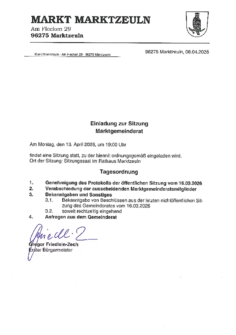 Einladung zur Marktgemeinderatssitzung