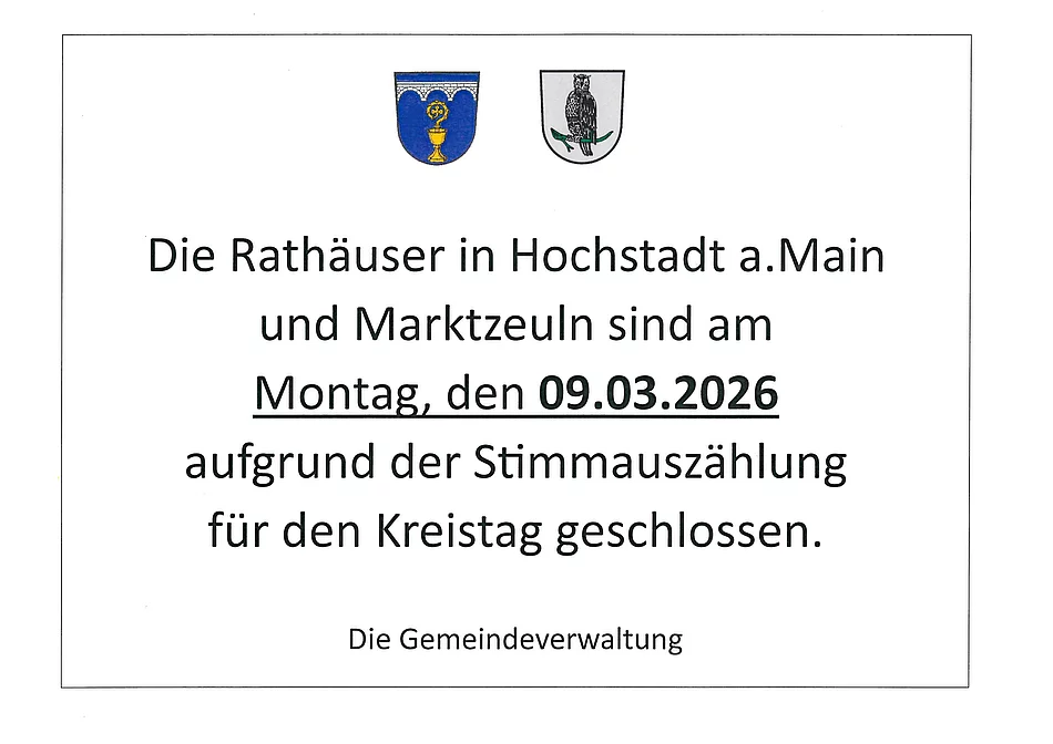 Die Gemeindeverwaltung teilt mit, dass die Rathäuser in Hochstadt a.Main und Marktzeuln am Montag, 09.03.2026 aufgrund der Stimmauszählung für den Kreistag geschlossen sind.