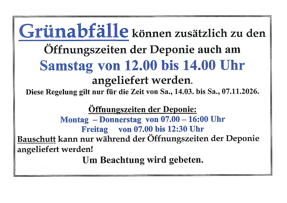 Grünabfälle können zusätzlich zu den Öffnungszeiten der Deponie auch am